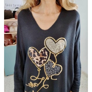 Jersey color negro con estampados de corazones, cuello en pico y de punto suave y acanalado.